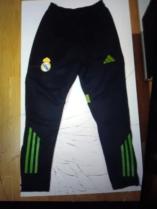 Chándal de fútbol del Real Madrid con detalles en verde , Todo bordado. Vendo por error d talla y no poder devolverlo . Talla 10/11 talla algo grande .Sin estrenar// Conserva la Etiqueta - Escudo del Real Madrid - Logo de Adidas. - Rayas deportivas en las perneras.