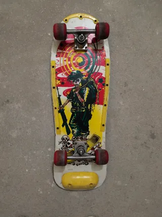 Skate clásico de los años 80 con un diseño llamativo. - Ruedas rojas. - Gráficos de esqueleto con rifle y calaveras. - Base blanca con detalles amarillos y rojos.