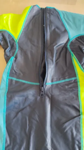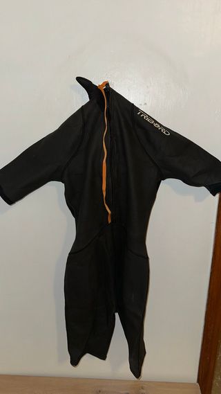 Neopreno de la marca Nabaiji, diseñado para triatlón. Solo 2 puestas en el tajo. Nunca usado en mar y sin marcas de uñas ni pipis 😅 110€ nuevo - Color negro con detalles en naranja. - Diseño de cuerpo completo.