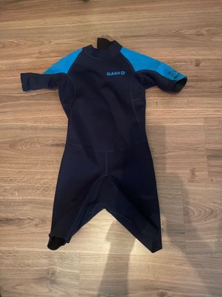 Neopreno de manga corta y pernera corta para niños y niñas, ideal para actividades acuáticas. - Color azul marino y azul. - Marca Olaian. - Talla 4. - Está en perfecto estado de uso ningún roto ni desperfecto