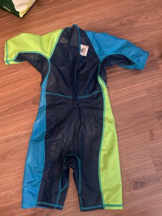 Conjunto de baño tipo neopreno para niños. Ideal para proteger del sol y el frío en la playa o piscina. Son 2, cada uno de distintos tamaño. Cierre de cremallera trasera. Manga larga y pernera corta. Si solo quieres uno, a 6 euros la unidad.