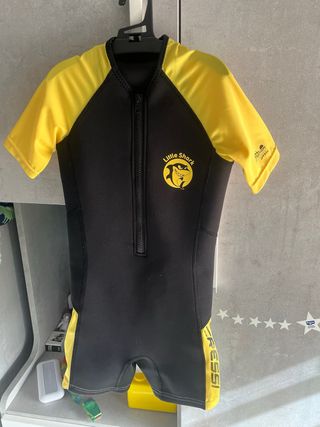 Traje de neopreno corto para niños 5/6 años ideal para actividades acuáticas. - Diseño en negro y amarillo. - Cremallera frontal. - Monoshort infantil mixto de Neopreno Y Elastán Es una excelente prenda polivalente para piscina y/o playa - Protege a los pequeños del frío, el sol, las medusas. Con protección solar Upf 50+ - Neopreno 2mm - Costuras planas pasantes con hilo anti rozaduras