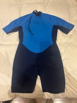 Traje de neopreno de manga corta y pernera corta, ideal para actividades acuáticas. - Color azul marino y azul claro. - Cierre de cremallera. - Costuras planas.