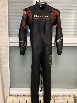 Neopreno de triatlón Aquaman Bionik 2.0 para hombre. - Color negro con detalles en rojo. - Diseño con mangas largas. - Cierre de cremallera. - Logo de Aquaman en el pecho. - Inscripción 2.0 en la manga. Diseñado para triatlon, esta bastante bien cuidado, tiene un pellizco pero es pequeño. TALLA S Tiene pocos usos.