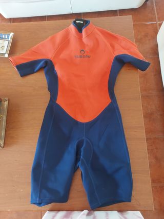 Traje de natación Tribord de decathlon de manga corta y pierna corta. 1,5mm. Color negro. Muy poco uso, tiene unas pequeñas manchas de humedad de estar guardado, que saldrán al limpiarlo