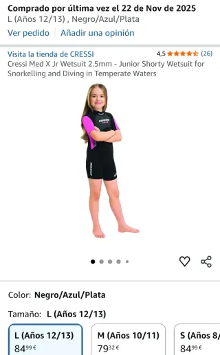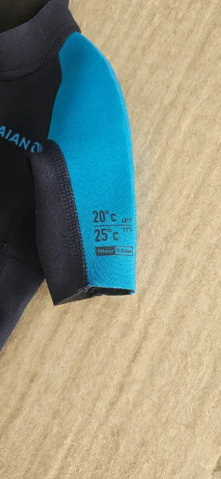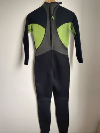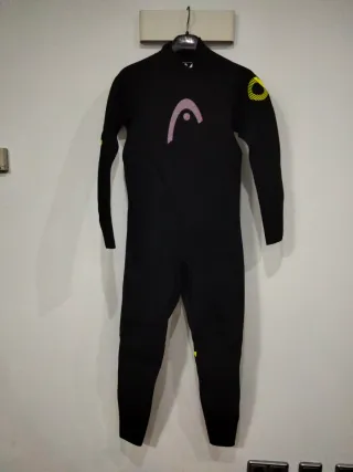 Usado una única vez. Mujer talla S / niño 14-16a. Grosor 1,5 mm. Etiqueta cortada por lo que lo que no sé exactamente qué talla marcaba. Mide 130 cm de cuello a pies. Yo mido 1’60 y me queda perfecto de largo. Usado una sola vez para nadar. Está como nuevo.
