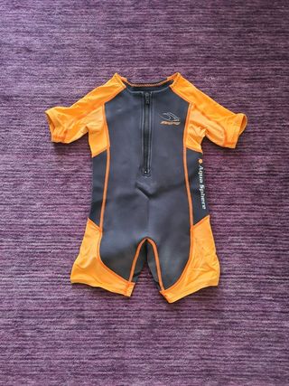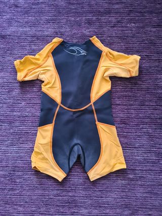 Traje de neopreno corto para niño de la marca AquaSphere. Está en buen estado y es ideal para actividades acuáticas. - Talla para niño o niña de 6 años - Color naranja y negro. La parte negra es de neopreno de 1 mm. La parte naranja de tela de baño y proteción solar