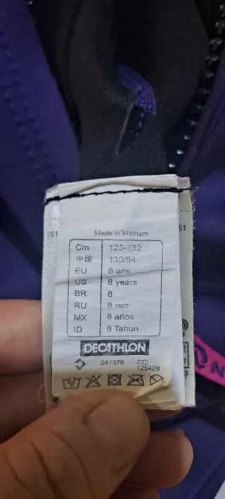 Neopreno de la marca Decathlon para niñ@s. - Talla 8 años. - Color morado. - Fabricado en Vietnam.