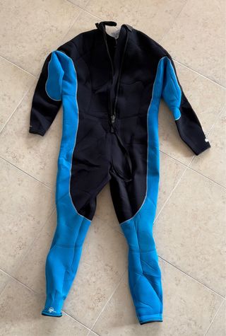 Traje de neopreno corto, ideal para diversas actividades acuáticas. Diseñado para ofrecer comodidad y libertad de movimiento. Talla mediana 10 a 13 años más o menos - Color azul y negro. - Manga corta. - Pierna corta.