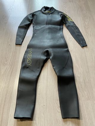 Traje Neopreno natación marca ZOOT modelo Synergy. Lo compré para iniciarme el verano pasado, pero no llegué a usarlo. Tiene algunas marcas por el uso, sobre todo en zona axilas, pero su estado es bueno y perfectamente utilizable. Cortado en zona pies para triatletas. Talla S. - Color negro. - Cierre de cremallera frontal. - Diseño con paneles texturizados en brazos y piernas.