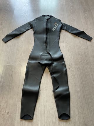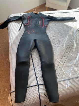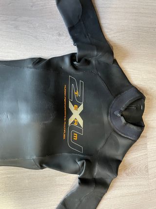Traje Neopreno natación marca 2XU. Lo compré para iniciarme en el mar el verano pasado, pero no llegué a usarlo. Su estado es bastante bueno, y sin marcas reseñables. Cortado en zona pies para triatletas. Talla MT. - Color negro. - Material de neopreno. - Logo de la marca 2XU en la parte frontal.