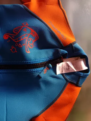 Neopreno infantil de la marca Tibord, diseñado para niños de 114 a 121 cm de altura. Ideal para actividades acuáticas. - Color azul y naranja. - Cierre de cremallera frontal. - Diseño con estampado gráfico en el pecho.