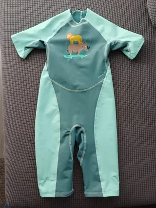 Traje de neopreno de manga corta y pernera corta, ideal para proteger del sol y el frío en el agua. Presenta un divertido estampado de animales. - Marca: Nabaiji (Decathlon). - Talla: 4/5 años. - Diseño: Manga corta y pernera corta. - Estampado: Animales (león, rinoceronte, cocodrilo). - Cierre: Cremallera en la espalda.