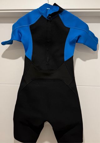 Traje de neopreno para bucear para niño/a. Manga corta y pantalon corto Sin apenas uso. Talla 12, pero talla pequeño. Mide 50 cm. del cuello a la entrepierna.