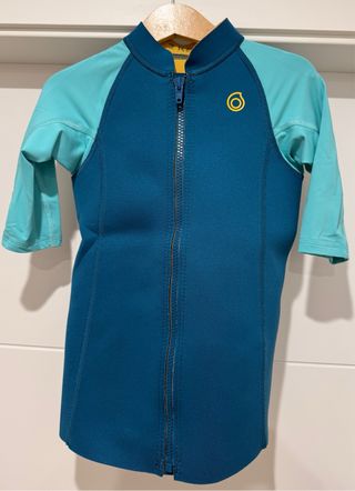 ¡Disfruta del agua con estilo y comodidad! 🏄♂️💦 Esta camiseta de neopreno para niños es ideal para verano y actividades acuáticas: 🌟 Destaca por: • Color azul y turquesa 💙💚 • Mangas cortas para total libertad de movimiento ✨ • Cierre de cremallera frontal fácil de poner y quitar ⚡ • Logo de la marca en el pecho 🔹 • Estado: en buen estado, listo para usar ✅