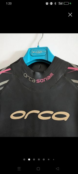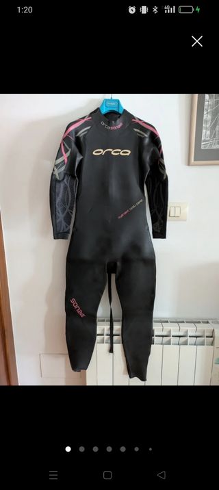 Neopreno Orca Equip mujer talla XS. pequeña abertura en la manga facilmente reparable. Se entrega con caja original. perfectamnwte conservado con talco (de ahi el color blanco)