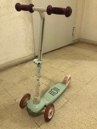 Patinete Oxelo de color blanco, diseñado para ser plegable.esta bastante usado pero funciona perfectamente tiene varias posiciones de altura de manillar se hace Muy rápido - Manillar ajustable. - Ruedas negras. - Plataforma para los pies.