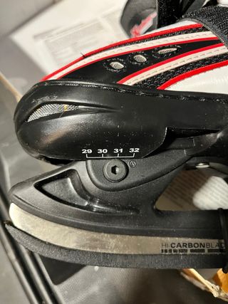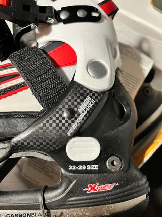 Patines de hielo de alto rendimiento. - Diseño en blanco y negro con detalles rojos. - Cierre de velcro. - Hoja de carbono. - Talla ajustable 32-29.