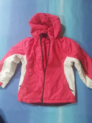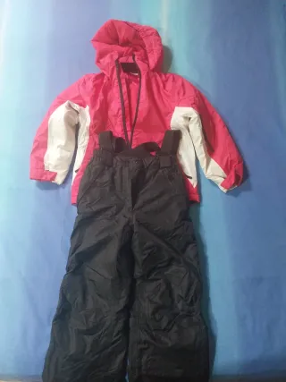 Conjunto de esquí para niña de 8 años, compuesto por chaqueta y pantalón. - Chaqueta de color rosa con detalles blancos y negros. - Pantalón negro con tirantes ajustables. - Cremallera frontal en la chaqueta.