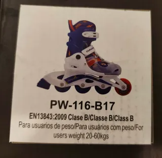 Patines en línea modelo PW-116-B17, diseñados para usuarios de entre 20 y 60 kg. - Certificación EN13843:2009 Clase B. - Diseño en azul y blanco con detalles naranjas. - Marca TIJUAN. Se incluye funda de transporte y elementos de protección (rodilleras) sin usar.