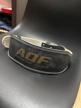 Cinturón lumbar de la marca AQF Fitness Gear, diseñado para soporte. - Material: Cuero. - Color: Negro. - Costuras reforzadas.