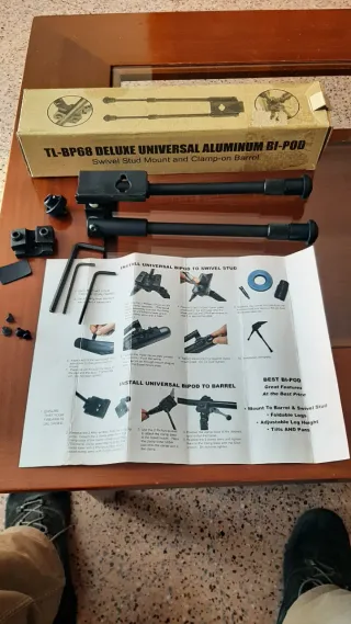 Bipode universal de aluminio TL-BP68 para rifle. Permite montaje en bípode giratorio o en cañón. - Construcción de aluminio. - Patas plegables. - Altura ajustable. - Permite inclinación y giro (tilts and pans).