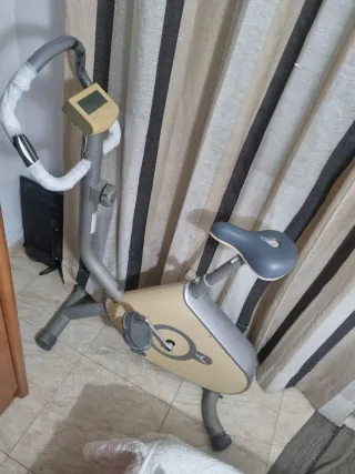 Bicicleta estática para ejercicio en casa. Diseño moderno en tonos gris y beige. - Pedales con agarre. - Asiento ajustable.