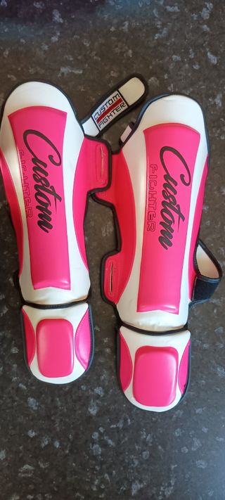 Espinilleras de la marca Custom Fighter en color rosa y blanco, una en talla M y otra en S.