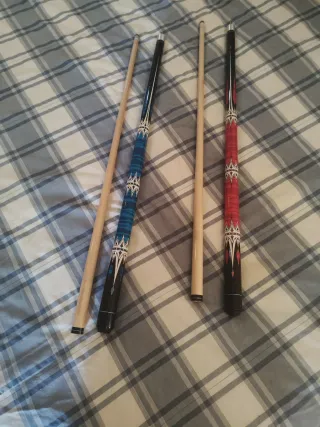 Se venden dos tacos de billar con diseños llamativos. - Taco con diseño rojo y negro. - Taco con diseño azul y negro. - Dos tacos de madera adicionales sin diseño.