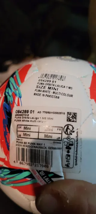 Balón oficial mini de La Liga de la marca Puma. - Diseño con detalles gráficos en rojo, azul y turquesa. - Logo de Puma destacado en negro.