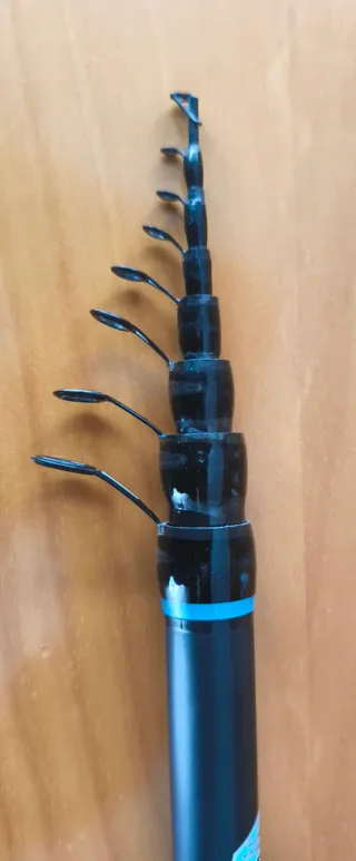 Caña de pesca Boloñesa de 6 metros. Porta carrete de cremallera Tramos, 6 Acción hasta 50 gr Longitud recogida, 132 cm Peso 311 gr Capuchón salvapunta Funda.