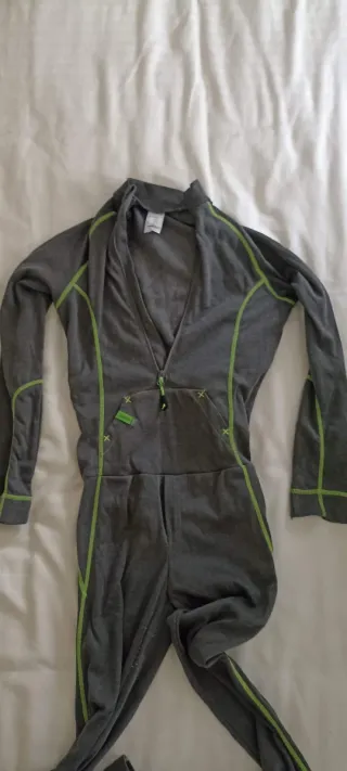 Mono interior térmico de una pieza, ideal para esquiar o actividades en la nieve. Diseñado para niños de 10 años. - Color gris con detalles en verde lima. - Cremallera frontal. - Bolsillo canguro.