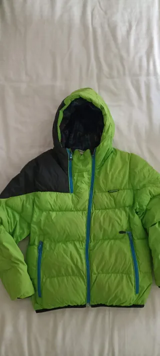 Abrigo de esquí de color verde lima y negro, ideal para niños y niñas de 8 años. Perfecto para mantenerse abrigado en la montaña. - Diseño bicolor. - Capucha integrada. - Cremallera frontal azul.
