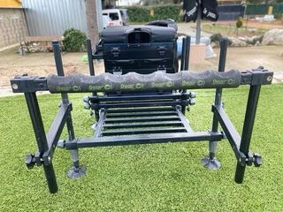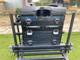 Panier de pata 25mm de aluminio, dos cajones frontales y dos bandejas extraibles laterales, más módulo extra. Asiento sin rotos ni descosidos, ni deformaciones. Ajustes de las patas y roscas de preston. Ligero de peso. Muy pocas salidas y muy cuidado.