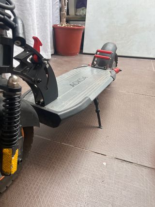 Patinete eléctrico de la marca AOKDA. - Plataforma gris con detalles. - Guardabarros trasero con soportes rojos. - Pata de apoyo.
