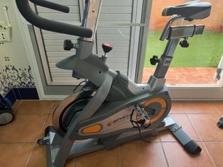Bicicleta estática BH Spada 2 Racing, ideal para entrenamientos en casa. Diseñada para ofrecer una experiencia de ciclismo indoor. - Modelo: Spada 2 Racing H9356i - Color: Gris con detalles naranjas - Manillar ajustable - Sillín ergonómico y ajustable - Pedales con correas