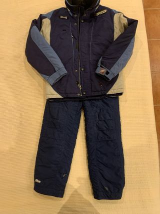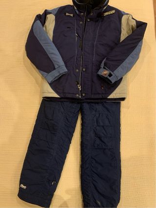 Conjunto de esquí infantil de la marca Spyder, ideal para los días de frío en la montaña. - Chaqueta azul marino y gris con detalles en azul claro. - Pantalón azul marino. - Cierre de cremallera frontal.