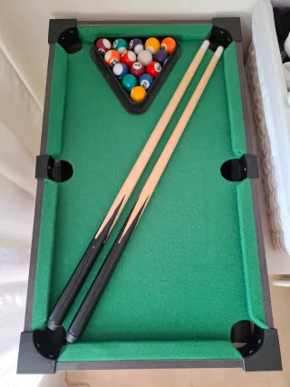 Divertida mini mesa de billar para jugar en casa. - Mesa de billar de color verde. - Incluye 14 bolas numeradas y una blanca. FALTA LA BOLA NEGRA. - Dos tacos de billar de madera.