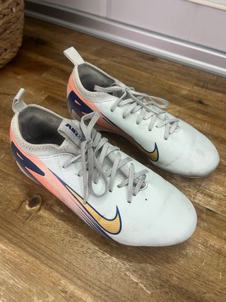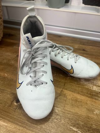 Botas de fútbol Nike Air Zoom en talla 35. Diseñadas para ofrecer comodidad y rendimiento en el campo. - Color azul claro con detalles dorados y rosas. - Cierre con cordones grises. - Logo de Nike en el lateral.