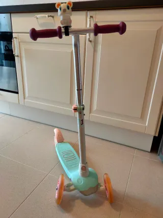 Patinete infantil Oxxelo de tres ruedas, ideal para los más pequeños. Su diseño es divertido y seguro. - Color menta y rosa. - Empuñaduras moradas. - Figura de hámster en el manillar.