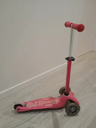 Patinete infantil de la marca Mini Micro en color rosa. Ideal para los más pequeños. - Diseño de tres ruedas para mayor estabilidad. - Ruedas delanteras con luces LED que se activan al rodar. - Mochila nevera Micro a juego.