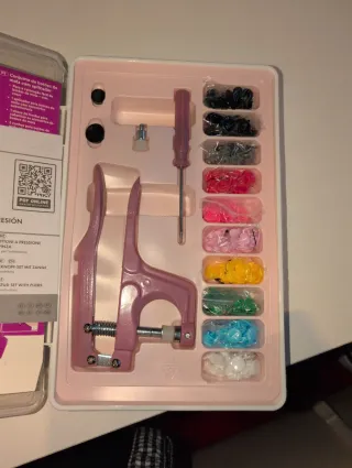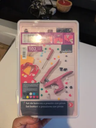 Kit de manualidades para crear tus propios botones a presión. Incluye una pinza y 107 piezas de botones de plástico en diversas formas y colores. - 100 botones automáticos de plástico. - Diseños variados en formas y colores. - Pinza para facilitar la colocación.