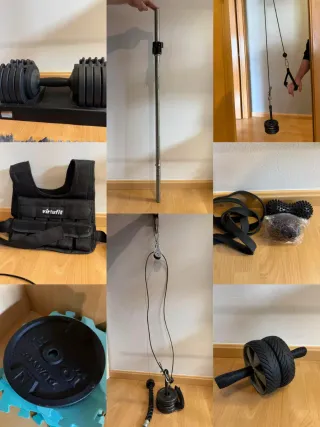 Conjunto de material para entrenamiento en casa o gimnasio casero. El material tiene poco uso, se usó unos meses escasos. El precio es por el pack completo, el cual incluye: - Mancuerna autoajustable marca Capital Sports de 5 hasta 25 kg. - Barra de 1,2m y 28mm de grosor con seguros. - Chaleco lastrado de 20 kg marca Virtufit con sus 20 lastres de 1kg de plomo. - Rueda abdominal. - Juego de polea alta para enganchar a una barra o similar que incluye una manilla de calidad y una cuerda para diversos ejercicios junto con plato para discos y 4 discos de 1KG. - 4 discos de 10kg de 28 mm (para polea y/o barra) Goma y pelotas de masaje.