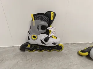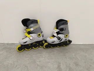 Patines en línea de la marca Oxelo, diseñados para patinaje recreativo. - Color blanco, gris y amarillo. - Cierre con cordones, velcro y hebilla. - Ruedas amarillas.