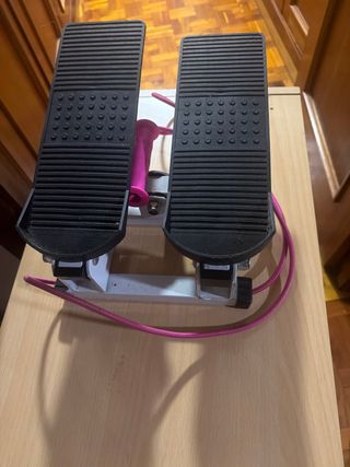 Stepper compacto con bandas elásticas para un entrenamiento completo. - Pedales antideslizantes. - Bandas elásticas de color rosa. - Estructura de metal blanco.