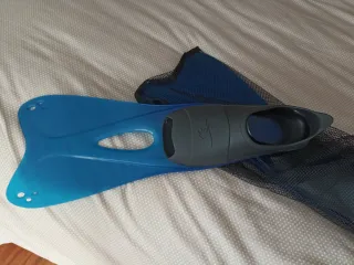Aletas de buceo de color azul, perfectas para nadar y practicar snorkel. Incluyen una bolsa de malla para transportarlas. - Pala ancha para mayor propulsión. - Diseño ergonómico para un ajuste cómodo. - Material flexible y resistente.