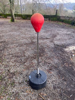 Vendo punching ball de Decathlon en buen estado de funcionamiento. Ideal para entrenamiento en casa, cardio o para niños/adolescentes. Base rellenable: Se puede llenar con arena o agua para máxima estabilidad. Estado: Tiene marcas de uso estéticas que no afectan para nada a su funcionamiento, todos los tornillos salen con facilidad (ver fotos). Está limpia y lista para usar. Regulable: Se puede ajustar la altura.