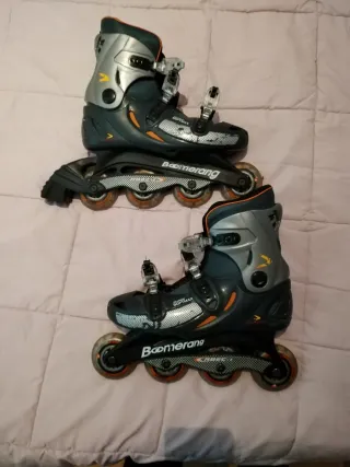 Se venden patines Boomerang en buen estado, ideales para iniciarse en el patinaje. Incluye un kit de 6 protecciones y una bolsa de rejilla para transportarlo todo. - Patines Boomerang - Kit de 6 protecciones - Bolsa de rejilla