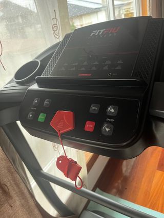 Cinta de correr FITFIU con consola digital. - Diseño moderno en color negro. - Panel de control con botones. - Incluye llave de seguridad roja. Está prácticamente sin estrenar. No tiene ningún desperfecto.