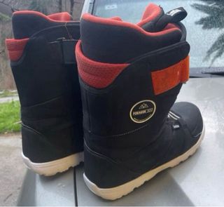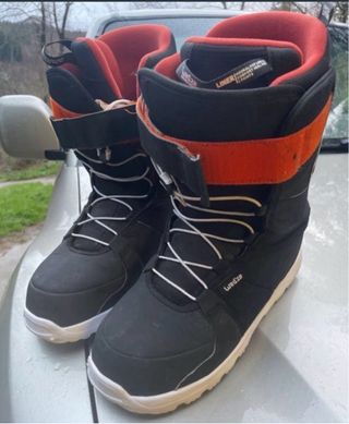 Botas de snowboard en color negro con detalles en naranja y cordones blancos. La talla es 45. - Cierre con cordones. - Forro interior rojo. - Correa de sujeción. - Suela blanca. Snow nieve